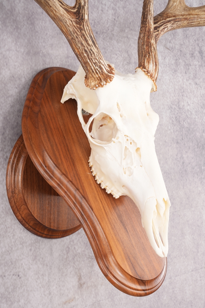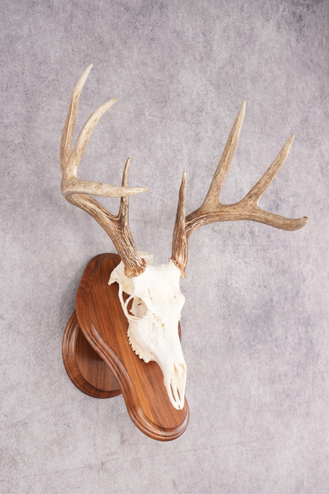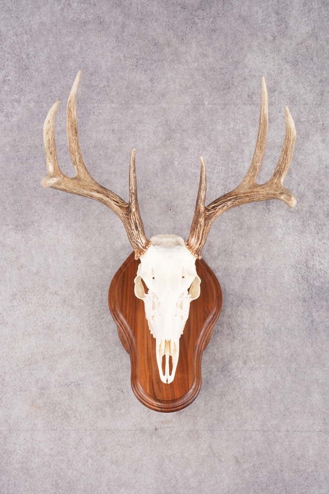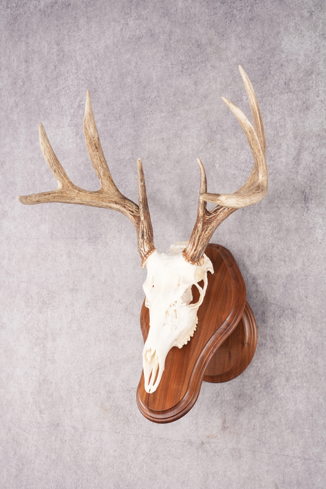 8 Point whitetail deer skull display on a beautiful walnut plaque. This skull has been clean professionally and is a perfect display piece.