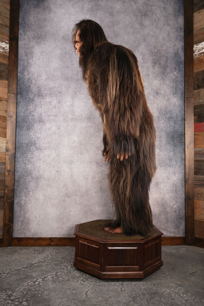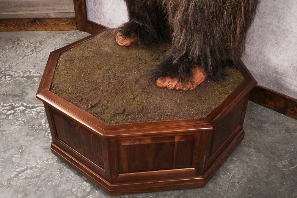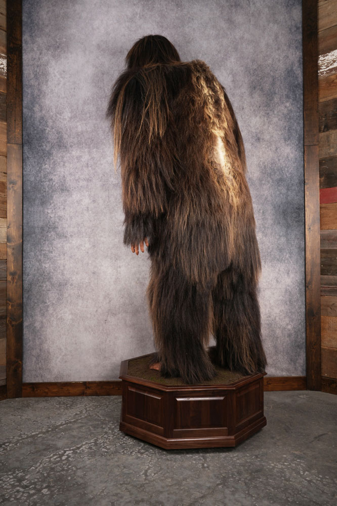 This museum-ready Big Foot replica stands tall at 130” / 11 ft including the base, and is made with real Musk Ox hide. Its facial features, fur, hands, and feet are all crafted with amazing attention to detail. The Big Foot stands on a quality Black Walnut octagon base. Girth of this beast is 84″ and has 19″ feet!