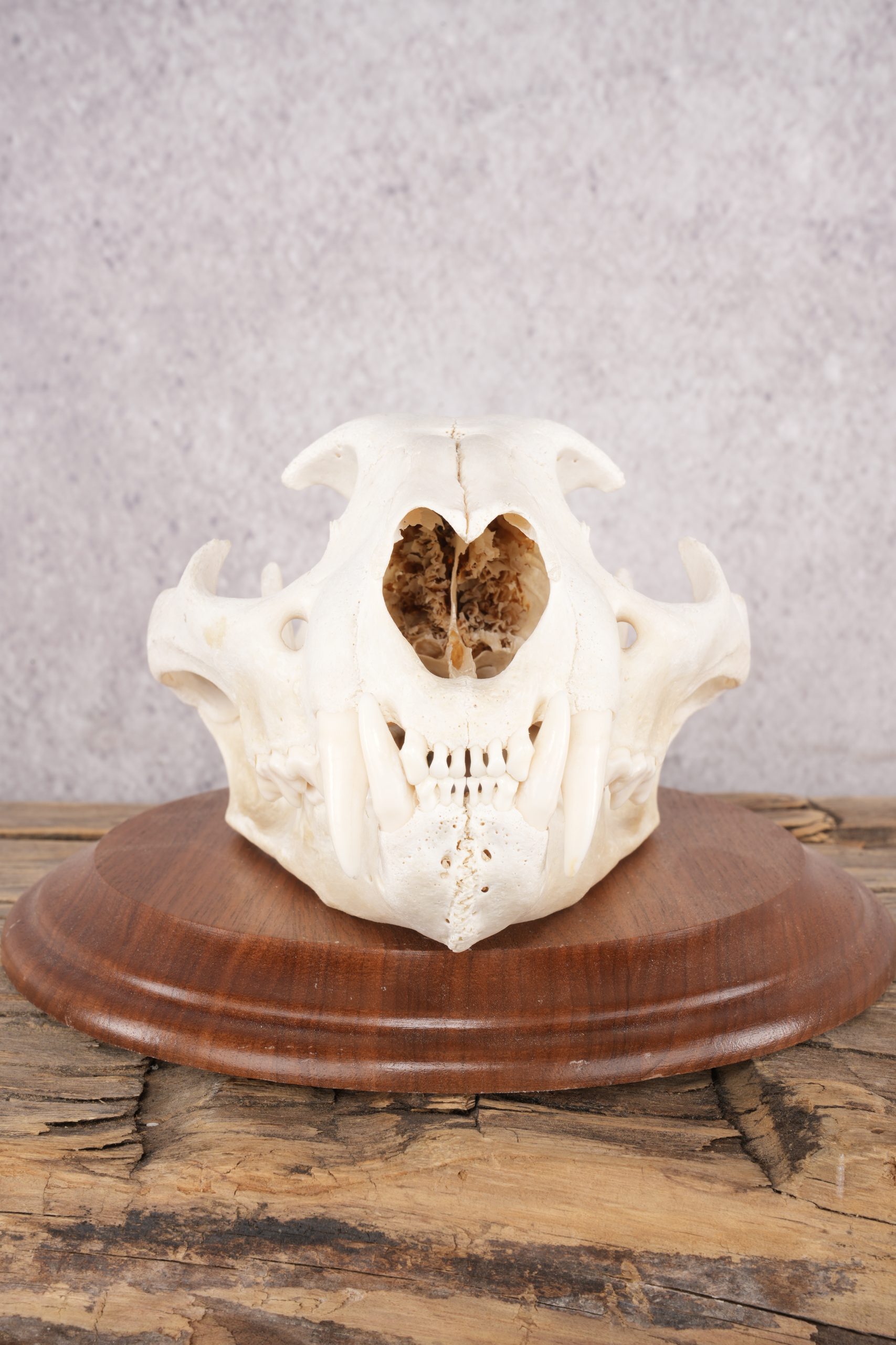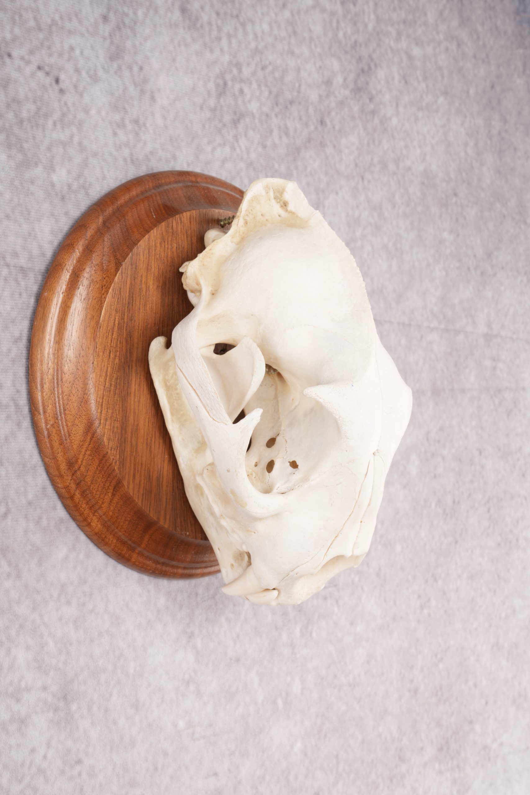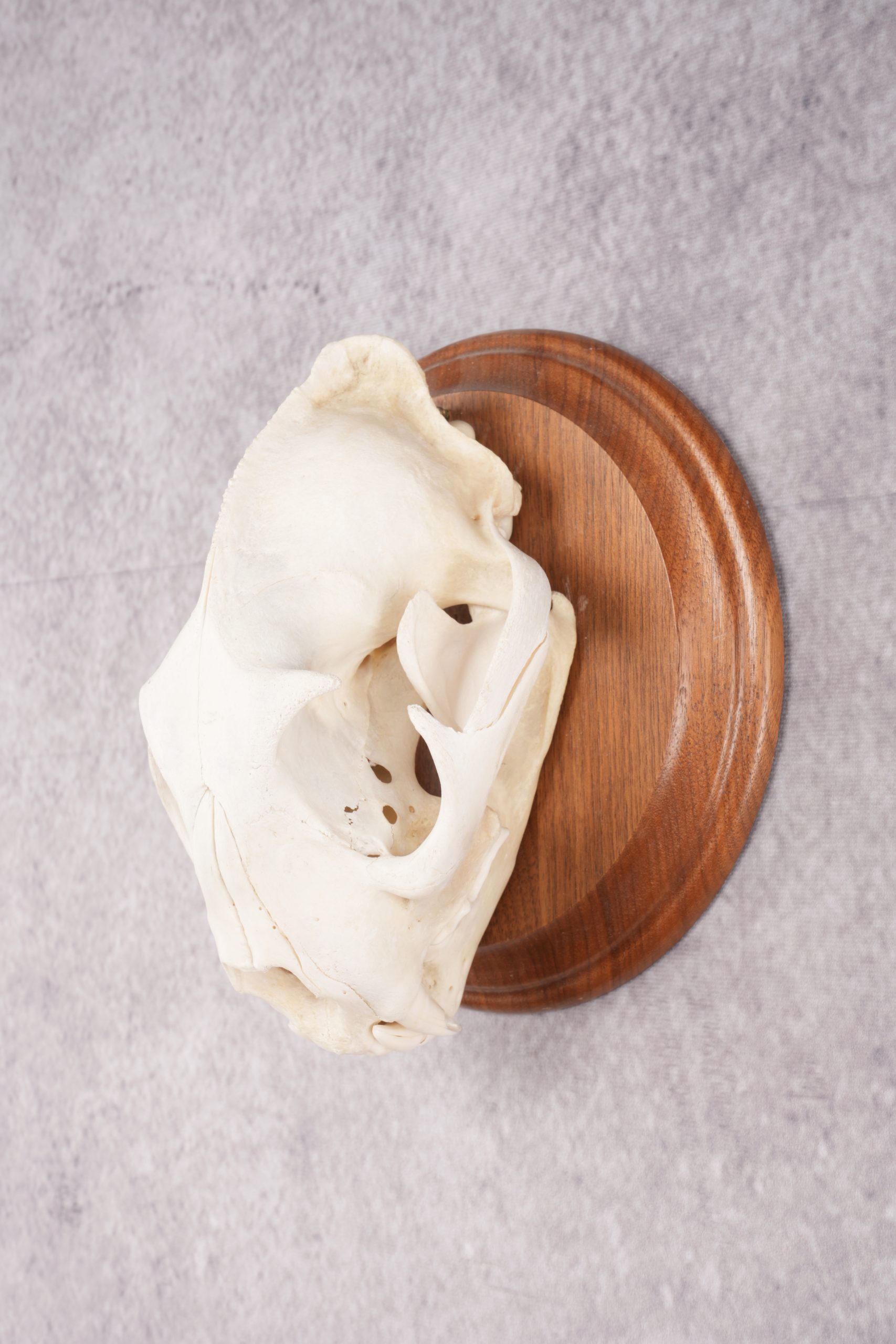 Superb cougar skull mounted to a wood plaque measures 5 3/8 by 7 7/8 inches.