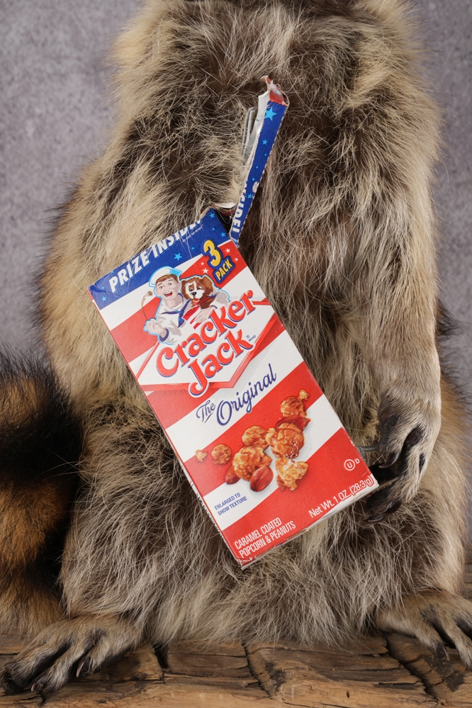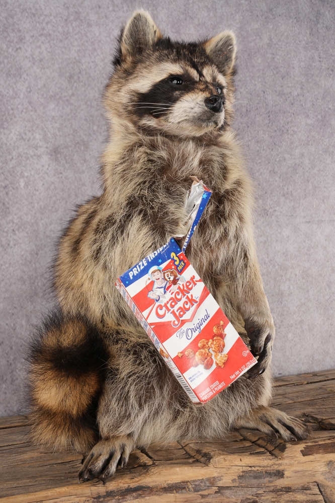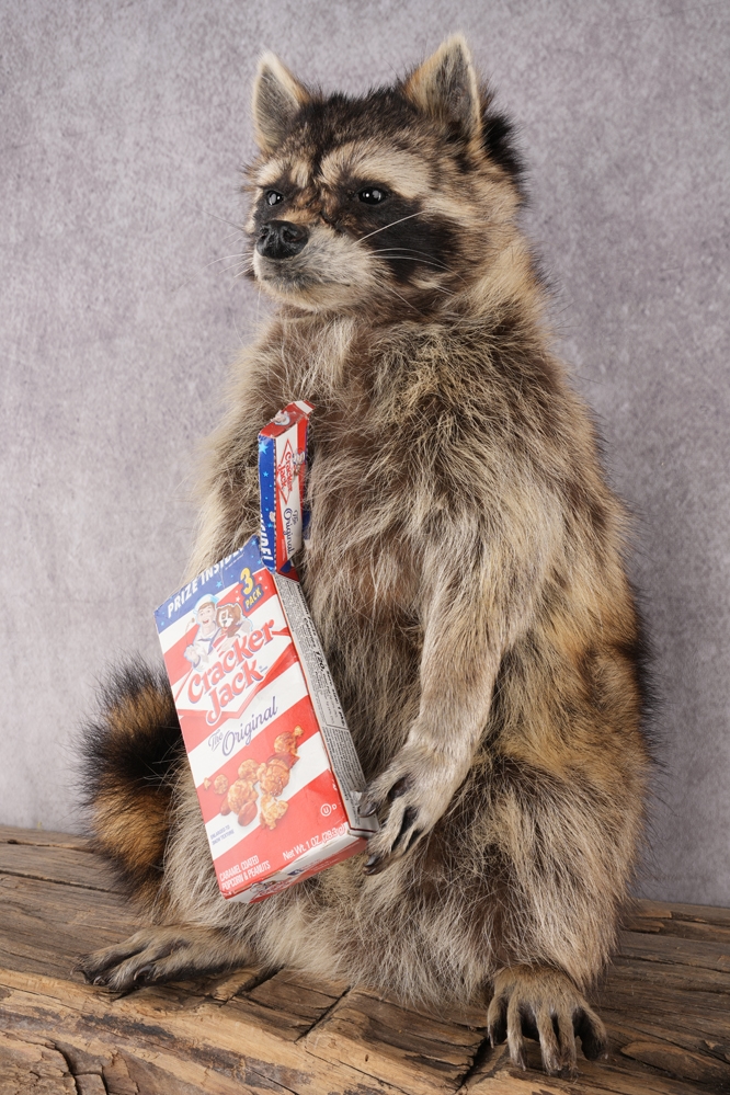 Raccoon Taxidermy Mount Holding Cracker Jack box SKU 1558
