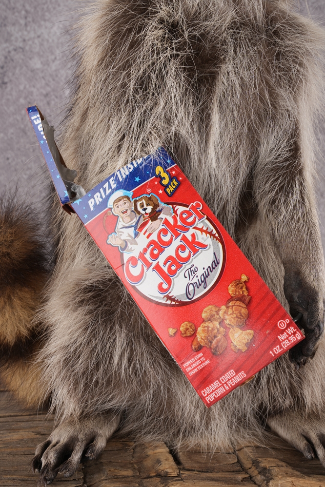 Raccoon Holding Cracker Jacks box perfect for the cabin, resort, bar, or great room.