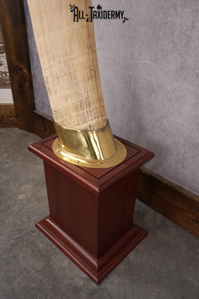 Reproduction elephant tusk on hardwood pedestals. These items has outstanding detail and is a must have for the trophy room. Made of resign, foam, and fiberglass would be the center piece to any trophy room.