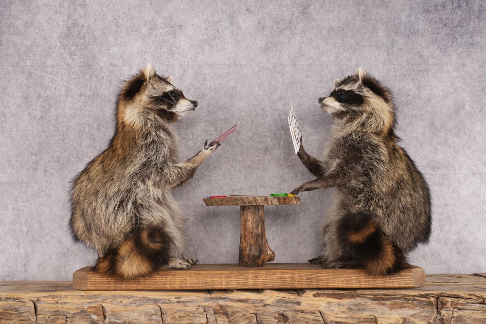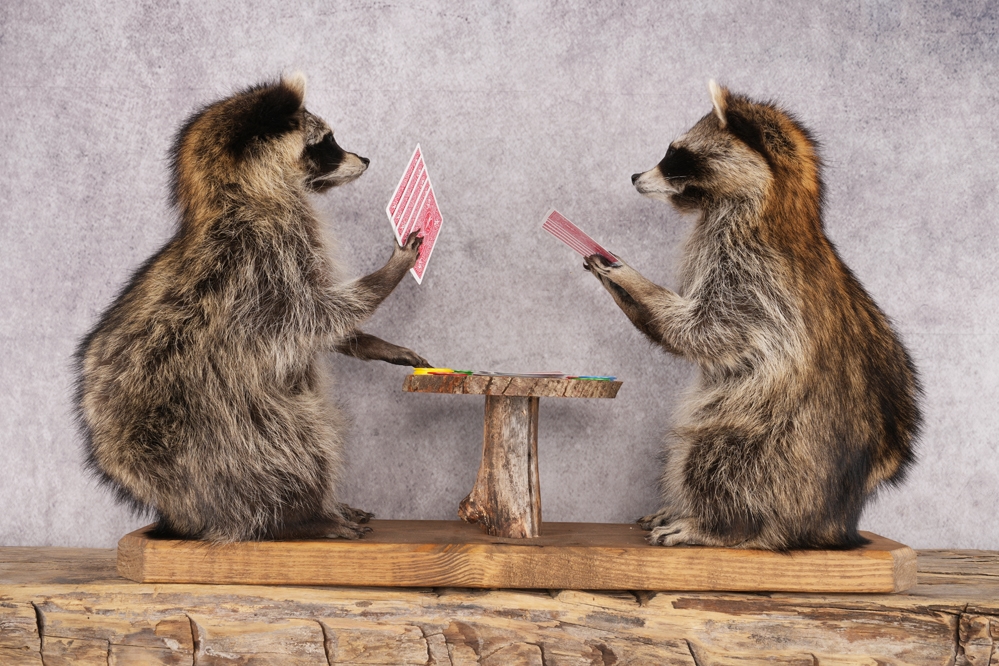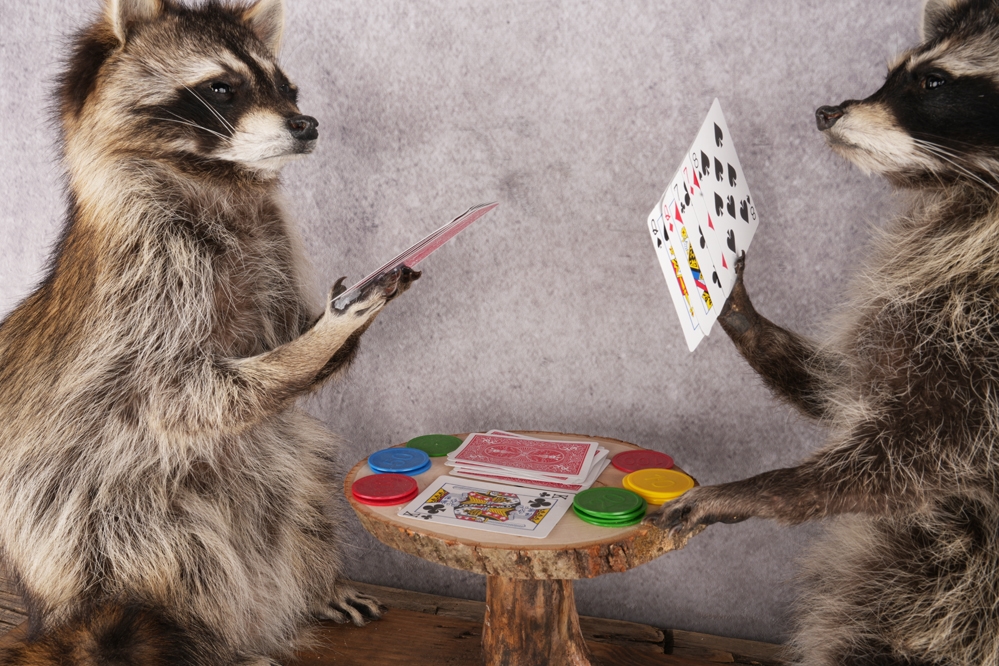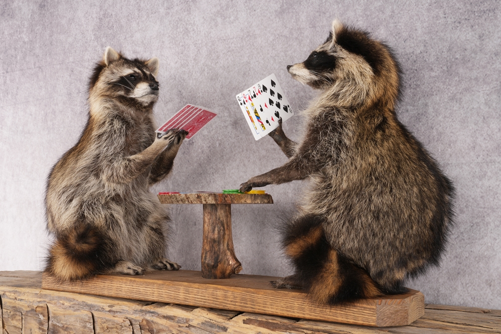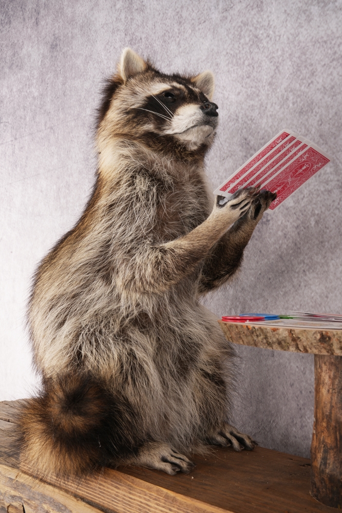 Poker playing raccoon display perfect for any atmosphere.