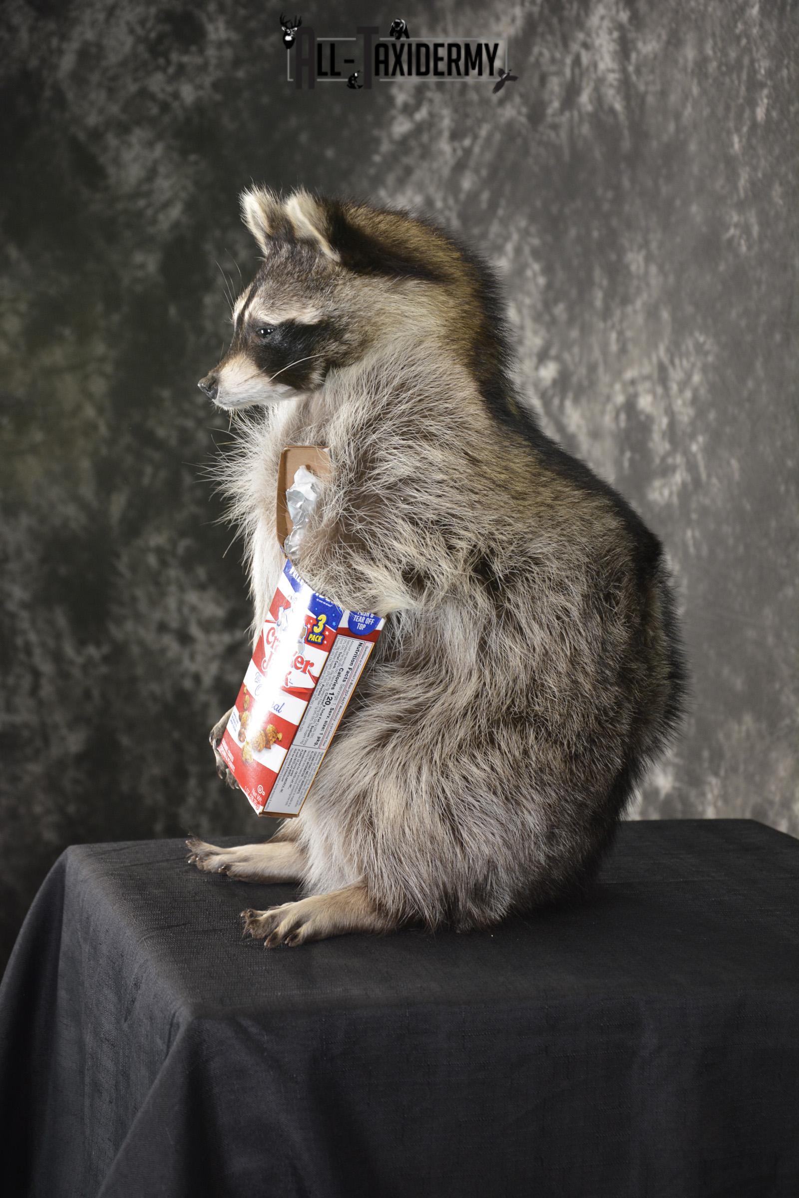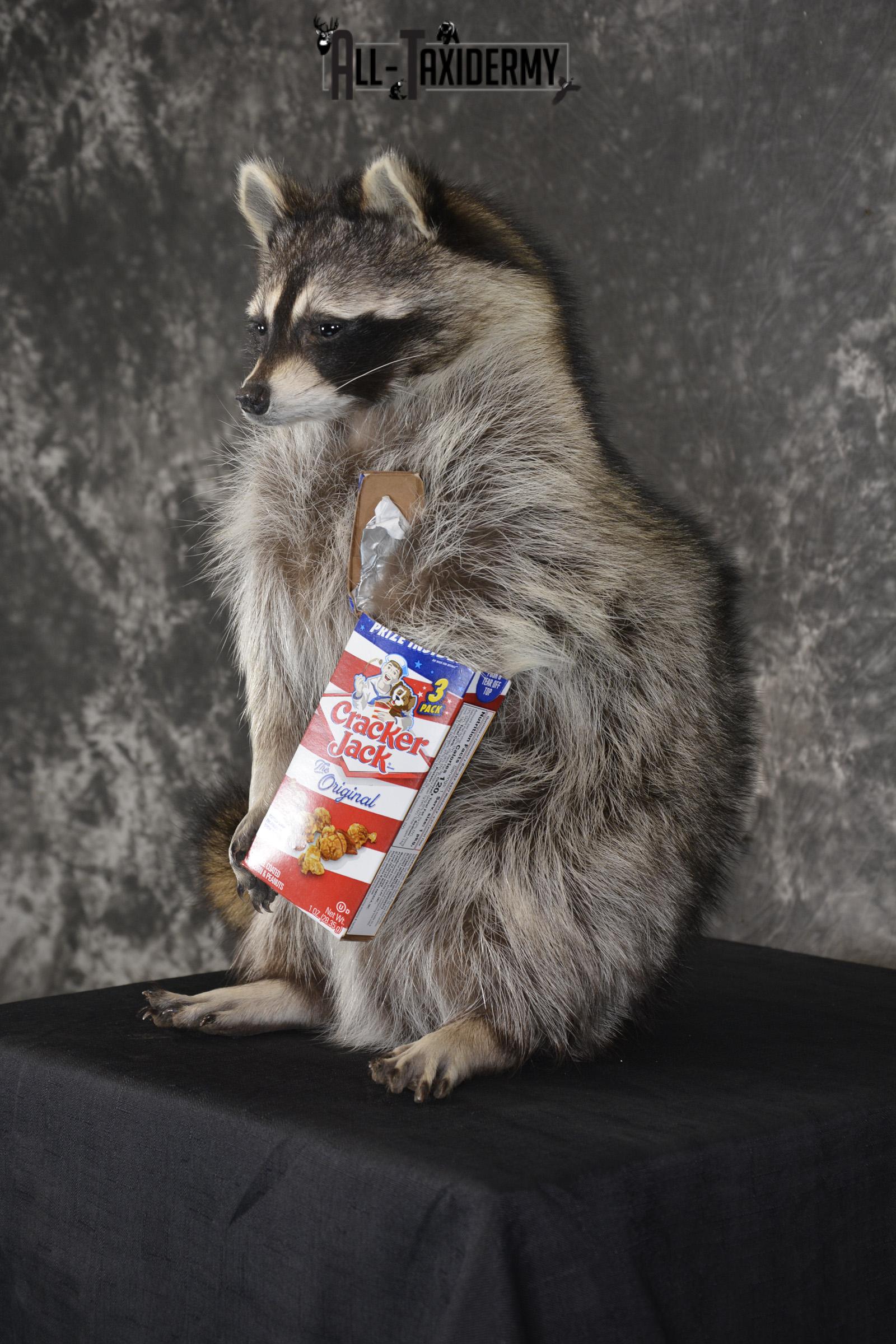Raccoon with Cracker Jacks novelty taxidermy mount for sale SKU 1866