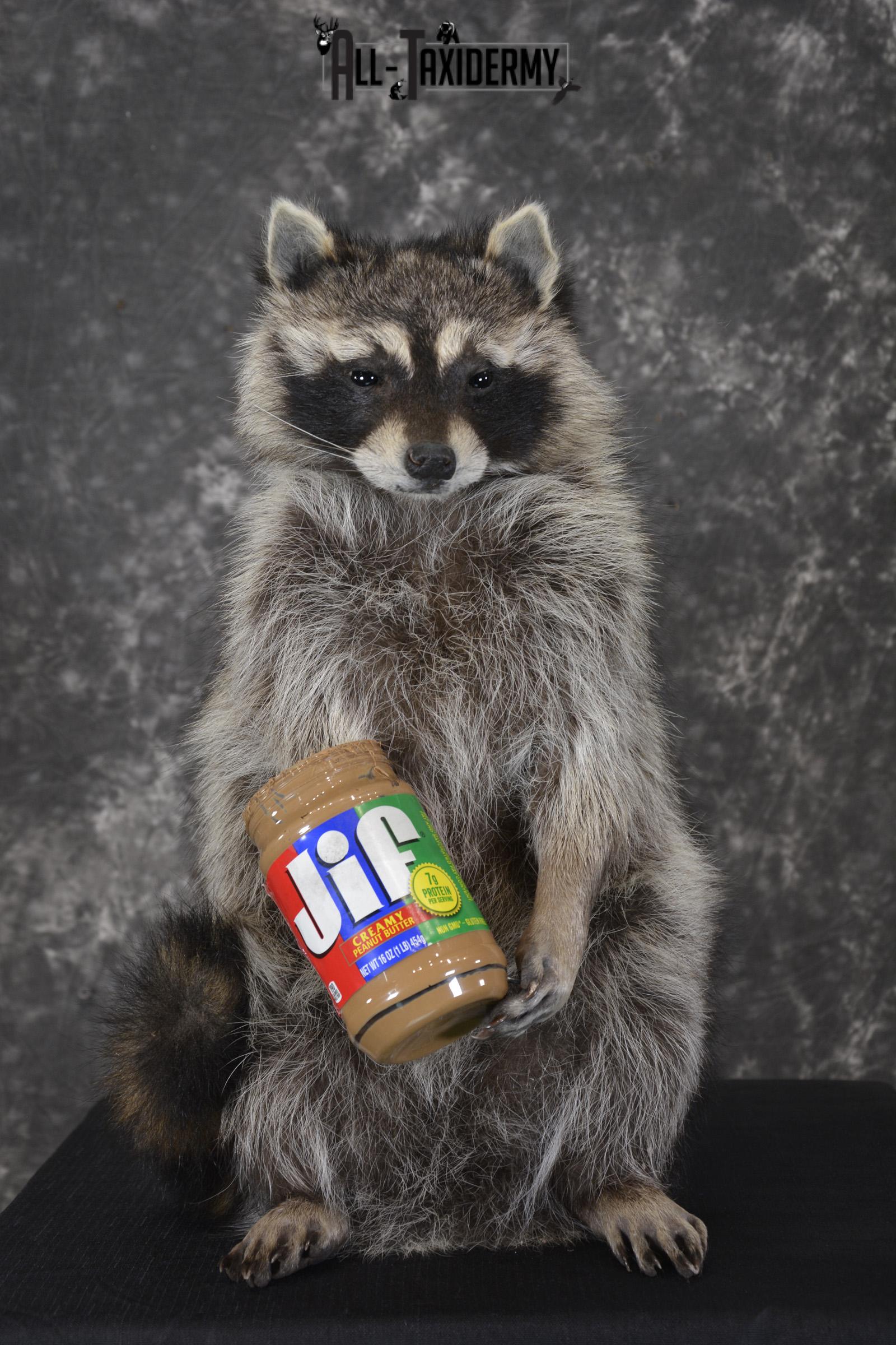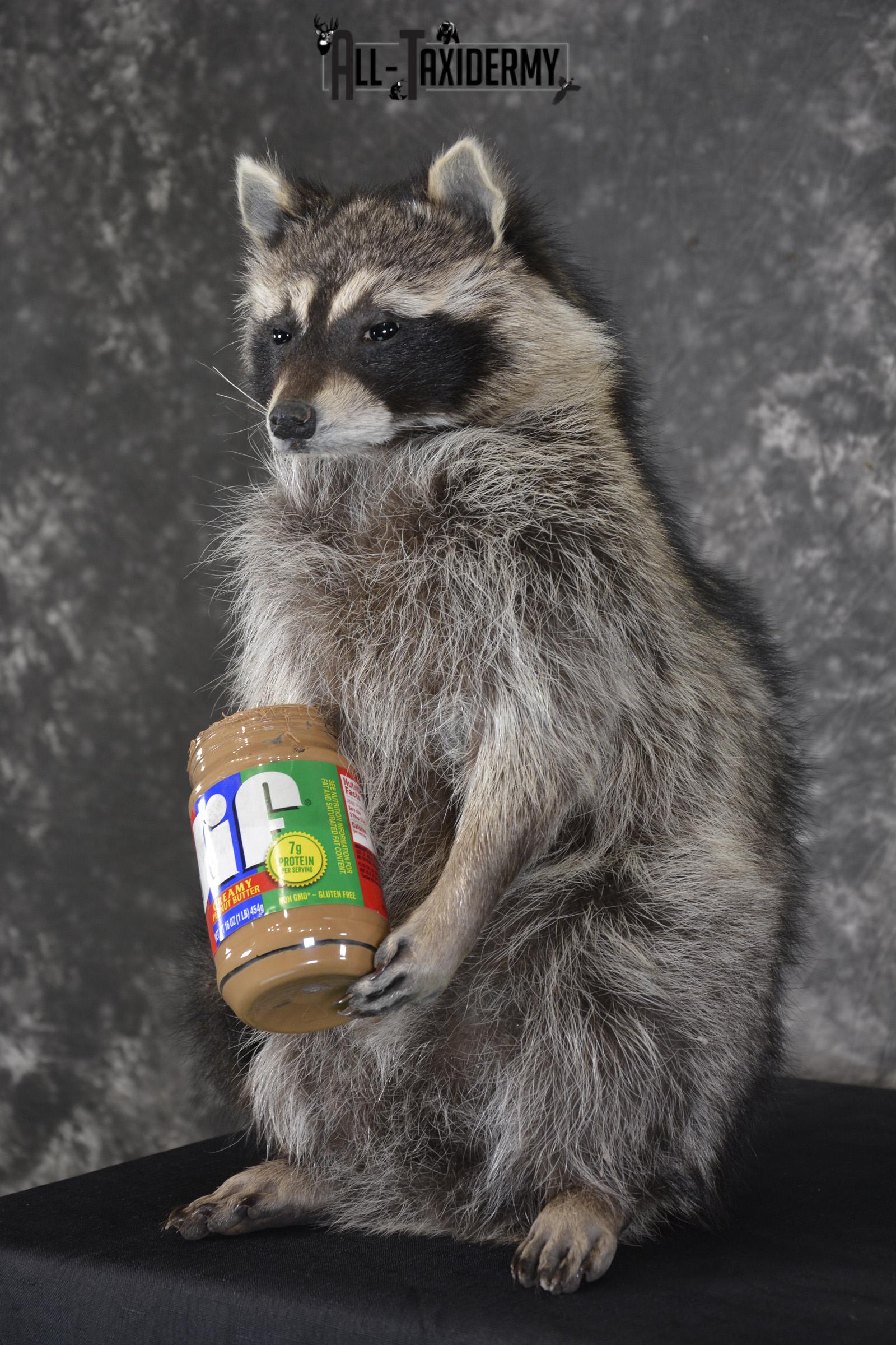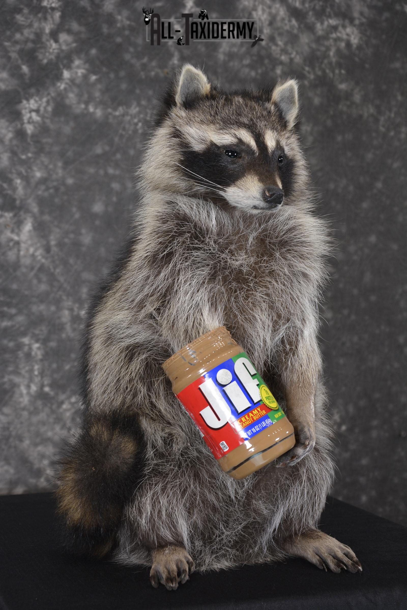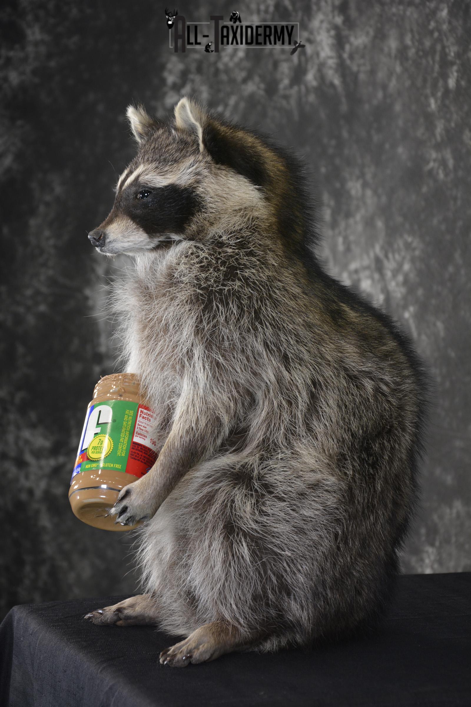 Raccoon with peanut butter jar novelty taxidermy mount for sale SKU 1874