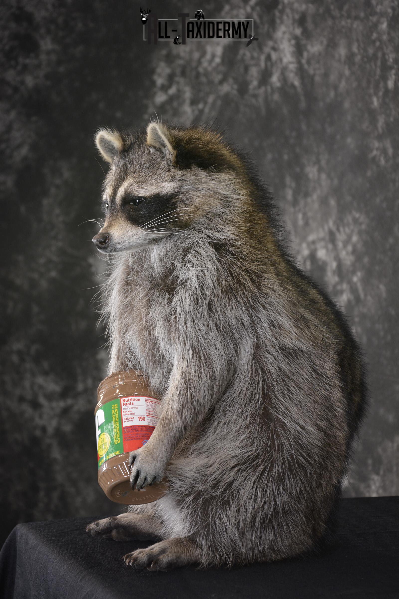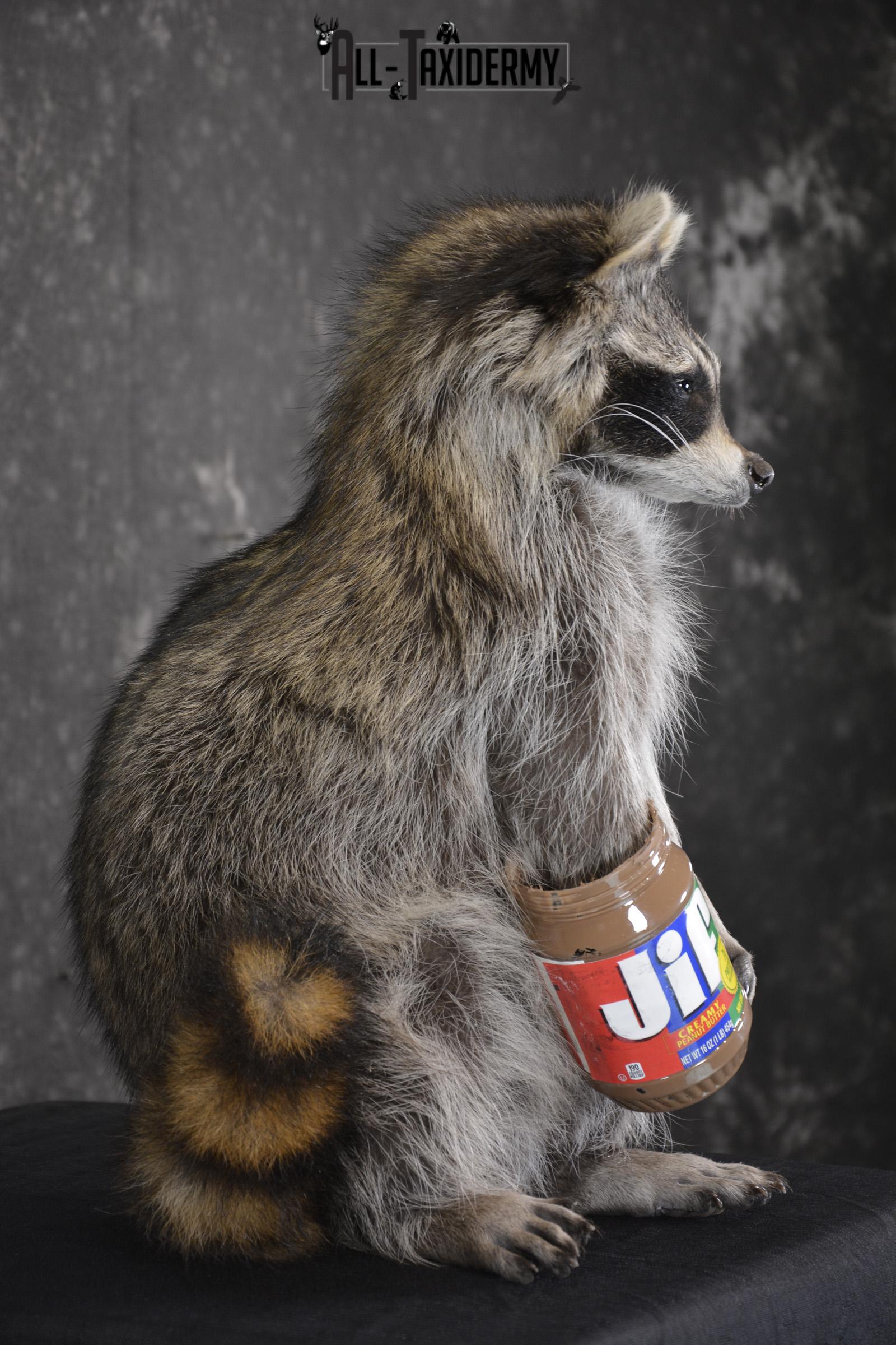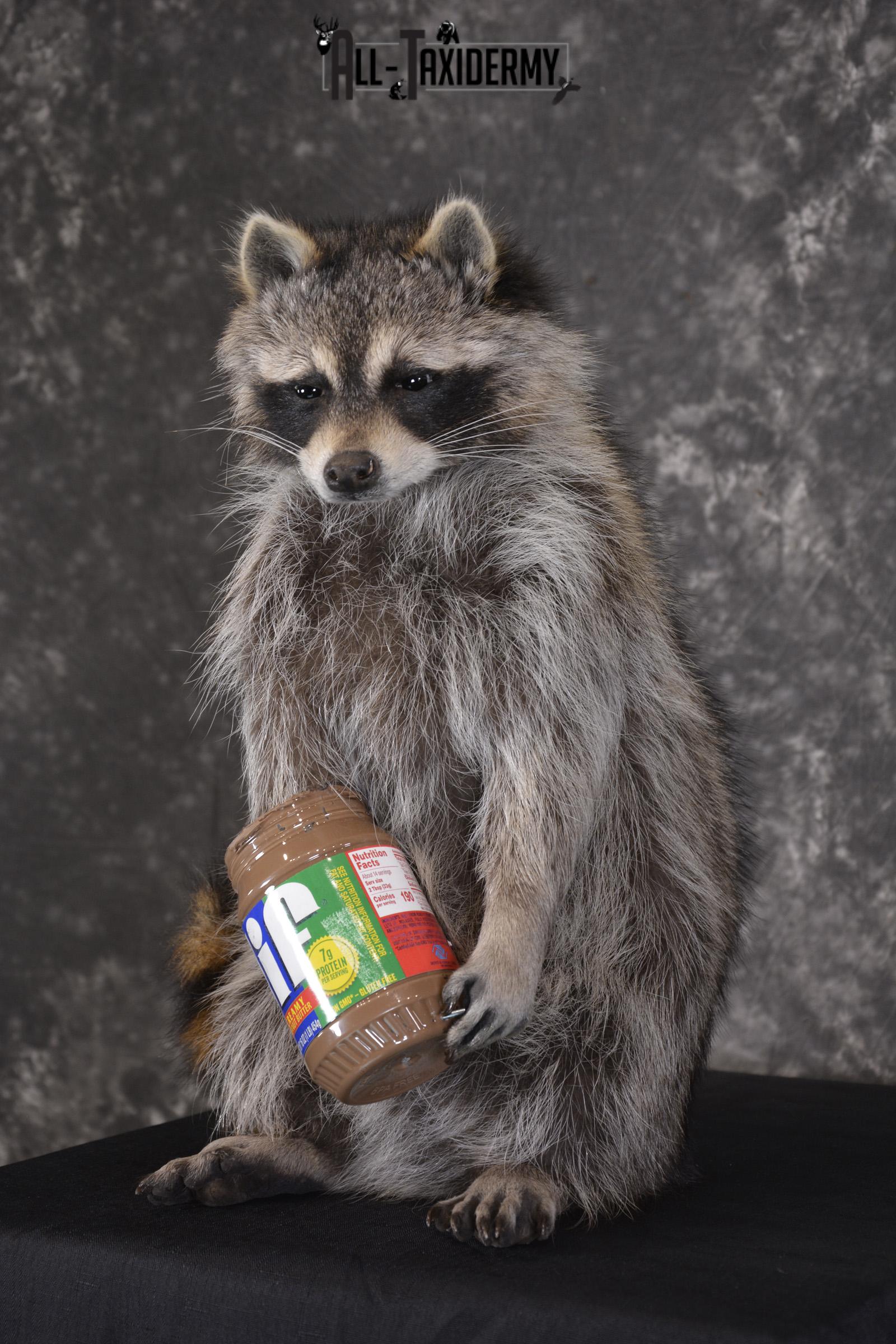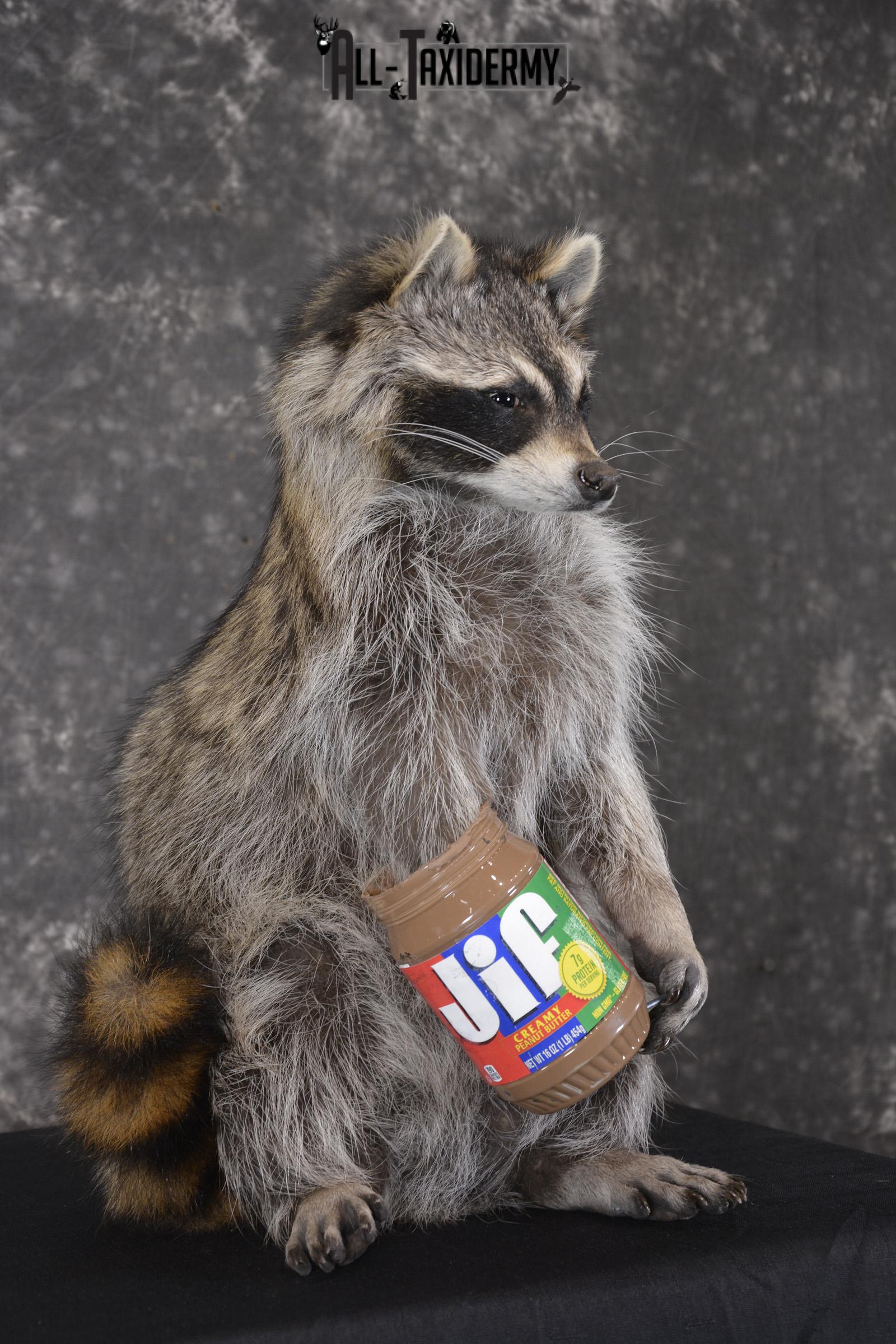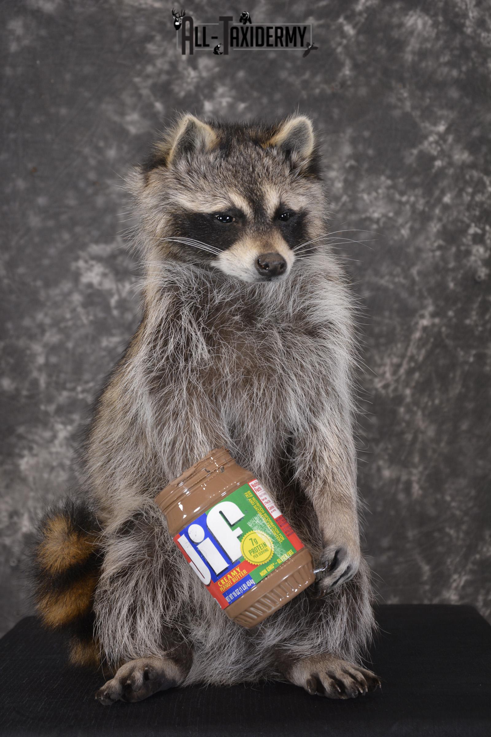 Raccoon with peanut butter jar novelty taxidermy mount for sale SKU 1875